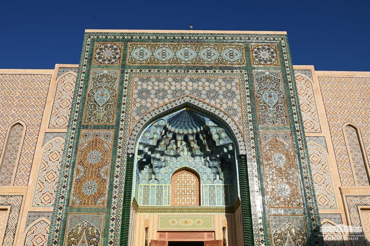 Мажмуанинг кириш қисмида томонлари 60 метрга 60 метрни ташкил қилувчи 4 минг кв.метр майдонни эгаллаган масжид биноси қад ростламоқда. Масжид пештоқининг баландлиги 29 метрни, гумбазнинг баландлиги эса 47 метрни ташкил қилади. Масжиднинг икки ёнида унга туташ даҳлизлар, ҳар бири бир вақтда 168 нафар кишига хизмат кўрсатувчи аёллар ва эркаклар таҳоратхоналари, мажмуа ходимлари учун хизмат хоналари барпо этилмоқда.